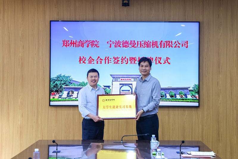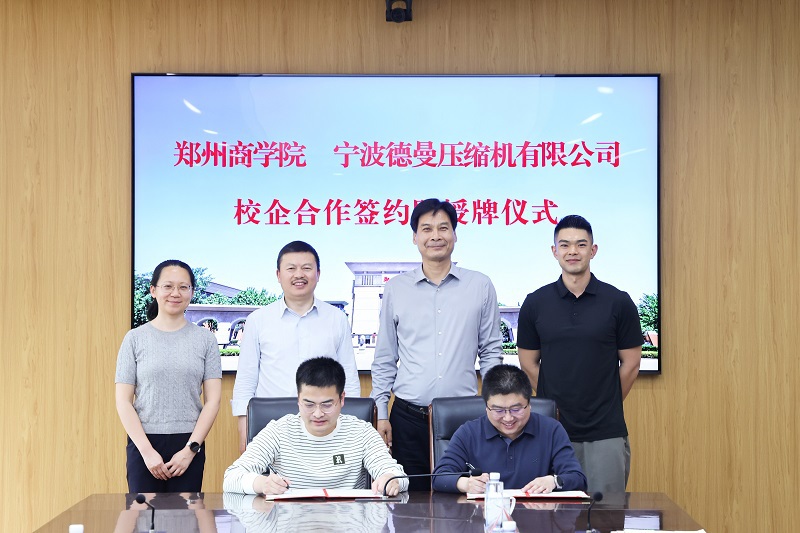 3月26日,宁波德曼压缩机有限公司董事长岑焕军一行莅临郑州商学院,在行政楼第一会议室举行校企合作签约暨授牌仪式。校党委书记吴建军、董事长助理陈宗纬、校长助理泥川等出席仪式。