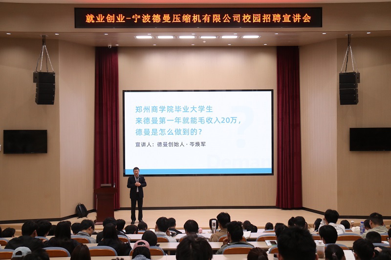 宁波德曼压缩机有限公司针对郑州商学院学生开展了专场招聘宣讲会。岑焕军董事长从企业文化、人才培育及晋升计划、招聘岗位、薪资待遇、往届毕业生发展等情况进行介绍。互动环节中,对同学们的问题一一作了解答,提供了专业指导,让同学们充分了解了企业信息和岗位信息。此次宣讲会不仅增进了学生与企业之间的了解,也为学生提供了宝贵的就业机会。相信在双方的共同努力下,我校学生能够在宁波德曼压缩机有限公司展现出更加卓越的风采。